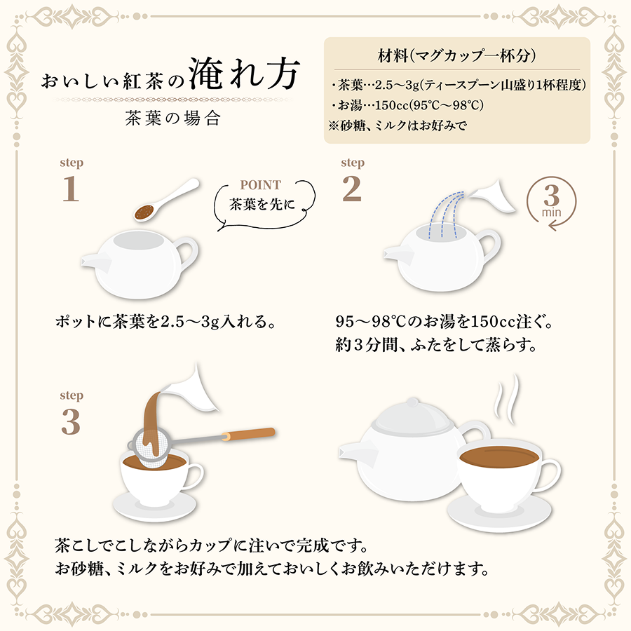 | 原材料名 | 紅茶、香料(カルダモン、クローブ、ブラックペッパー、シナモン、ショウガ、ナツメグ、ロングペッパー) |